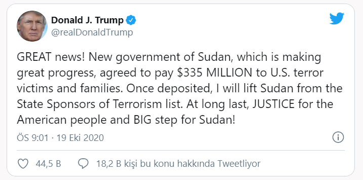 Başkan Trump paylaşımında "Müthiş haber! Büyük ilerleme kaydeden Sudan'ın yeni hükümeti, ABD'li terör kurbanı ailelerine 335 milyon dolar ödeyecek. Para yatırıldıktan sonra Sudan'ı "teröre destek veren" ülkeler listesinden çıkaracağım. Nihayet, Amerikan halkı için adalet ve Sudan için büyük bir adım!" dedi.