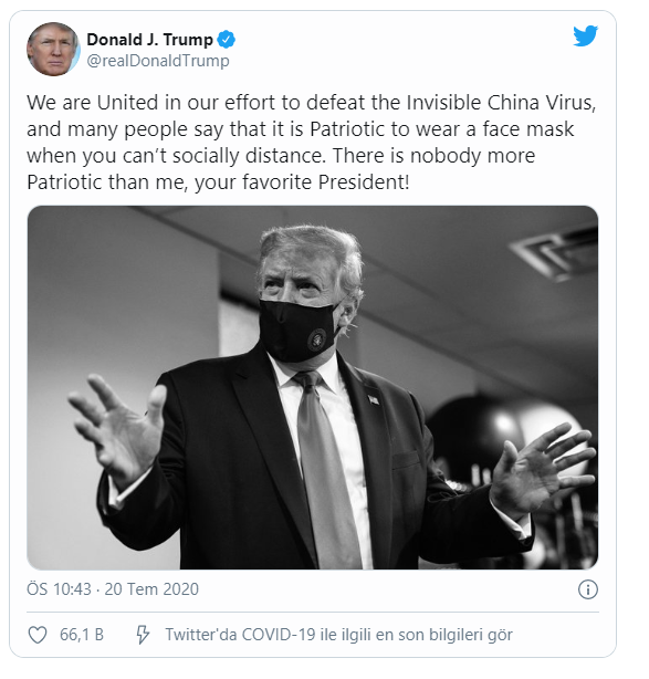 Salgının başından bu yana ilk kez yüzünde maske varken çekilmiş bir fotoğrafını paylaşan Donald Trump, "Görünmez Çin virüsünü yenme çabalarında hepimiz birlik olduk ve bazıları sosyal mesafeyi koruyamadığınız yerde maske takmanın vatanseverlik olduğunu söylüyor. Kimse benden daha çok vatansever olamaz, favori başkanınızım." ifadesini kullandı.