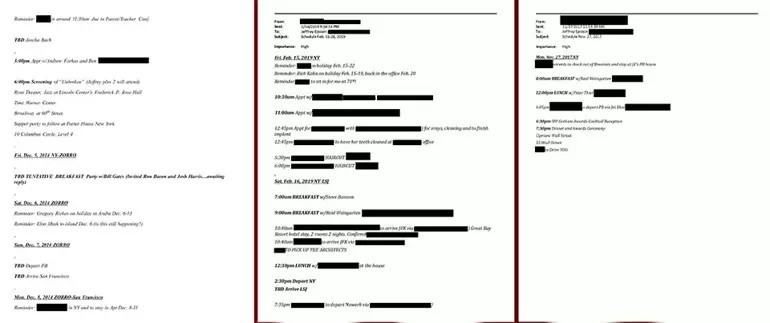 Musk’ın adı, Epstein’in ABD’deki özel adasına 6 Aralık 2014 tarihinde yapılacak bir seyahate ilişkin planda geçerken, ilgili bölüme "Hatırlatma: Elon Musk 6 Aralık’ta adaya (bu hala geçerli mi?)" notunun düşüldüğü görüldü. Belgelere göre, Epstein 27 Kasım 2017’de Thiel ile öğle yemeği, 16 Şubat 2019’da ise Bannon ile kahvaltı planladı. Ayrıca Prens Andrew’in isminin, 12 Mayıs 2000’de Epstein ve ortağı Ghislaine Maxwell ile New Jersey’deki Teterboro’dan Florida’daki West Palm Beach’e yapılacak bir uçuşa dair listede yer alması dikkat çekti.