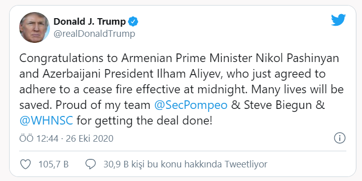 Trump, "Ateşkes yapmayı kabul eden Ermenistan Başbakanı Nikol Paşinyan ve Azerbaycan Cumhurbaşkanı İlham Aliyev'e tebrikler. Birçok hayat kurtarılacak. Ekibimle gurur duyuyorum." dedi.