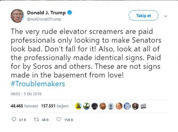 Eylemcilerin ‘para ödenmiş profesyoneller’ olduğunu öne süren Trump, cuma günü paylaştığı bir tweette Twitter’dan “Senatörleri kötü göstermek için tutulmuş asansör eylemcileri paralı profesyonellerdir. Tuzağa düşmeyin” dedi. Trump posterlere işaret ederek “Soros ve diğerleri tarafından ödendi” iddiasında bulundu.
