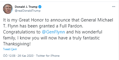 Trump yaptığı açıklamada, "General Michael Flynn'e tam af çıkardığımı duyurmaktan gurur duyuyorum. General Flynn ve harika ailesini tebrik ederim, artık gerçekten şahane bir Şükran Günü geçireceğinizi biliyorum." dedi.