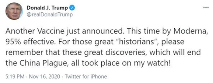 ABD Başkanı Donald Trump, sosyal medya hesabından yaptığı açıklamada Moderna aşısının "kendi döneminde" bulunduğunu ifade ederek, "Başka bir aşı az önce duyuruldu. Bu sefer Moderna tarafından yüzde 95 etkili. O büyük ‘tarihçiler’, lütfen ‘Çin Vebasını’ sona erdirecek bu büyük buluşların hepsinin benim dönemimde gerçekleştiğini unutmayın" ifadelerini kullandı.