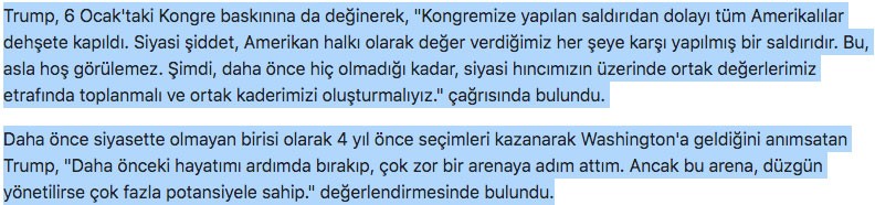 ABD’nin eski Başkanı Trump, "Amerikan ordusunu yeniden inşa ettik. Yaptıklarımız gerçekten muazzamdı. Biz sıradan bir yönetim değildik. Bir şekilde geri döneceğim. Pandemi bizi etkilememiş olsaydı, inanılmaz rakamlara ulaşacaktık. Kongreye çok teşekkür etmek istiyorum birlikte çok iyi çalıştık, en azından bazı unsuralarıyla" dedi. Trump, "Şunu bilmenizi isterim ki, bizim başlattığımız hareket henüz daha başlangıç." mesajını verdi.