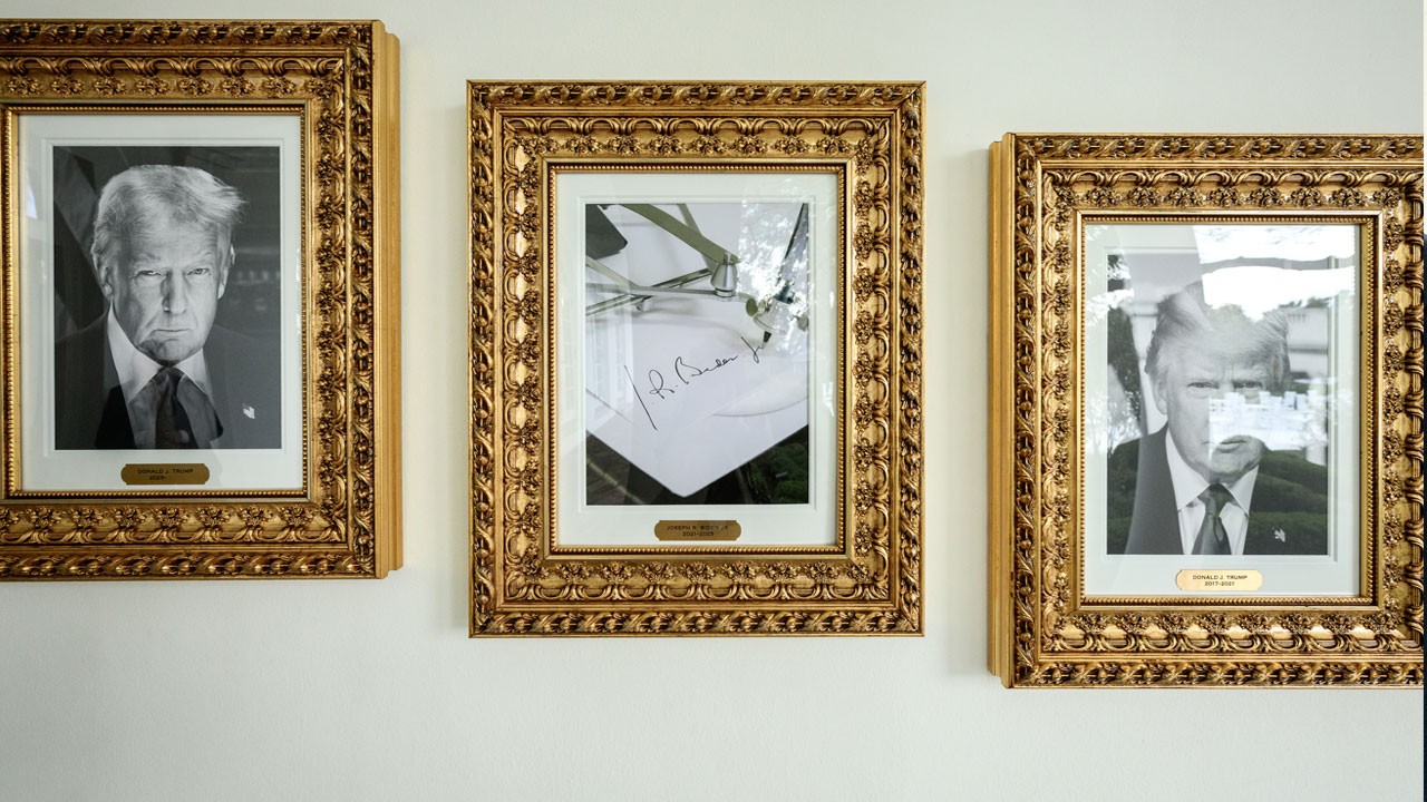 Beyaz Saray’da oluşturulan yeni ‘Başkanlık Şöhret Yolu’nda önceki başkanların portrelerine yer verilirken, Joe Biden için portre yerine otomatik kalem fotoğrafı asıldı.