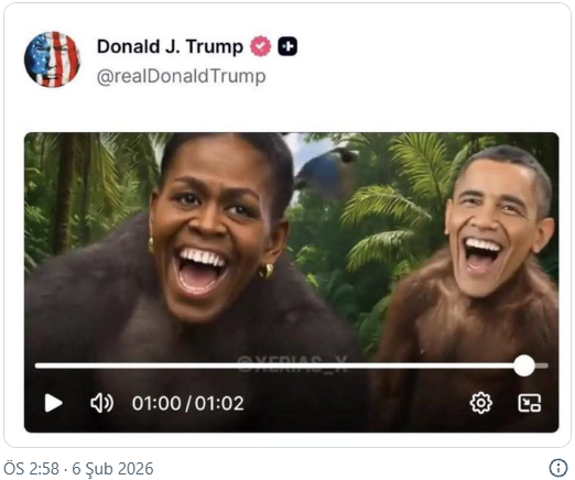 ABD Başkanı Donald Trump, eski ABD başkanı Barrack Obama ve eşi Michelle Obama’nın yapay zekayla maymun olarak tasvir edildiği videoyu sosyal medyasında paylaştıktan sonra tepkiler üzerine sildi.