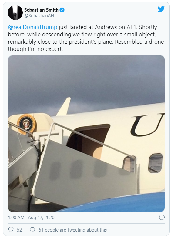 Görgü tanıkları haç şeklindeki sarı-siyah renklere sahip İHA'nın uçağın sağ tarafında olduğunu belirtti. İHA'nın Maryland'deki Joint Base Andrews üssüne Trump'ın uçağı inmeden kısa bir süre önce görüldü.