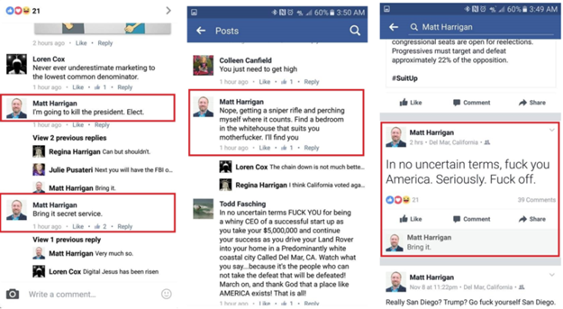 San Diego merkezli siber güvenlik firması PacketSled'in CEO'su olan Matt Harrigan, Donald Trump'ın başkan seçilmesinin ardından Facebook hesabında bir sniper tüfeği alarak Trump'ı öldüreceğini söylediği bazı yorumlar yazdı. Ayrıca Trump'a bazı küfürler de sarfeden Harrigan, gelen tepkilerin üzerine ise CEO'luk görevinden alındı.
