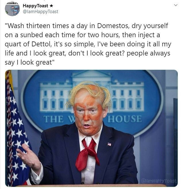 ABD Başkanı Donald Trump, koronavirüs tedavisi için deri altına dezenfektan enjekte etmenin işe yarayıp yaramayacağının araştırılmasını önerdi. Trump'ın bu önerisi Twitter'da alay konusu oldu.