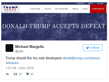 Cumhuriyetçi adayın sitesinde sadece URL kısmı ile oynayarak, istediği mesajı yazdıran hackerlardan biri olabilirdiniz.Örneğin; “donaldjtrump.com/press-releases/archive/donald&trump&accepts&defeat” yazan biri sayfaya “donald trump accepts defeat” yazdırıyordu, Türkçesi; “donald trump yenilgiyi kabul ediyor".