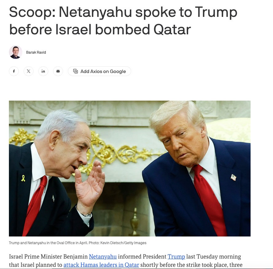 Axios gazetesinin yedi İsrailli yetkiliye dayandırdığı haberine göre, İsrail Başbakanı Binyamin Netanyahu, ABD Başkanı Donald Trump’a, geçen haftaki saldırıdan önce İsrail’in Katar’daki Hamas liderlerine saldırmayı planladığını bildirdi. Beyaz Saray , füzeler havaya kalktıktan sonra bilgilendirildiklerini ve bu nedenle Trump’ın saldırıya karşı çıkma fırsatı bulamadığını iddia etmişti. Ancak Axios, İsrailli yetkililere dayanarak Amerikalıların, durdurma takviminin kısıtlı olmasına rağmen, saldırıyı daha önceden bildiklerini ve istemeleri halinde saldırıyı durdurabileceklerini bildirdi.