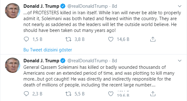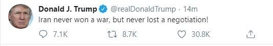 ABD Başkanı Donald Trump, İran Devrim Muhafızları Kudüs Gücü komutan Kasım Süleymani'nin öldürülmesiyle ilgili ilk açıklamayı Twitter'dan yapmıştı Trump yaptığı paylaşımda, "İran hiçbir savaşı kazanamadı ama hiçbir pazarlığı kaybetmedi" ifadelerini kullanmıştı.