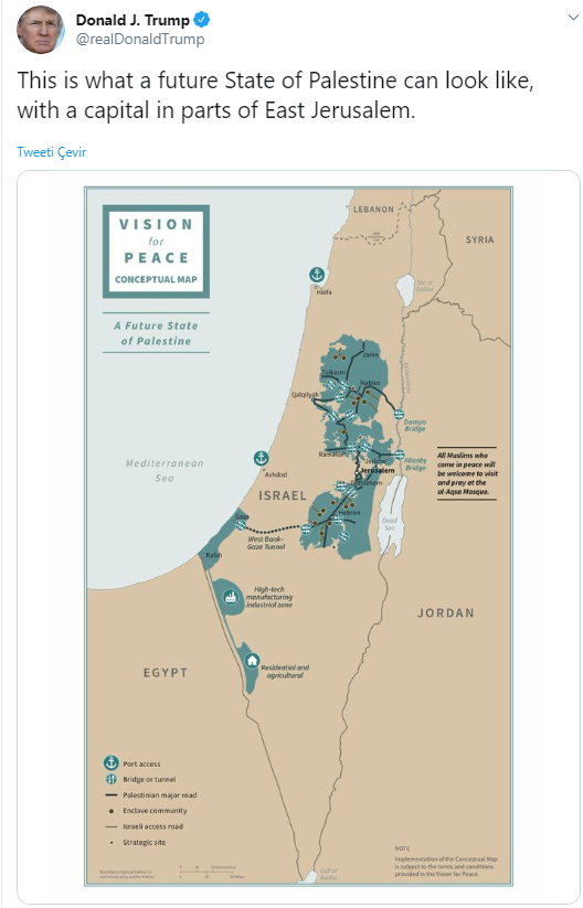 ABD Başkanı Donald Trump, sözde Orta Doğu barış planı kapsamında öngörülen işgalci terör devleti İsrail ve Filistin devletlerinin sınırlarını gösteren bir haritayı paylaştı.