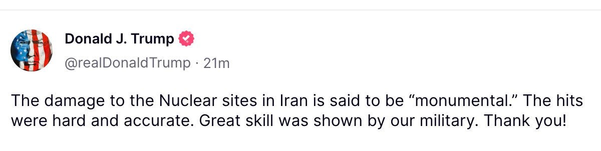 İran'daki Nükleer tesislerdeki hasarın "anıtsal" olduğu söyleniyor. Vuruşlar sert ve isabetliydi. Askerimiz büyük bir beceri gösterdi. Teşekkürler!