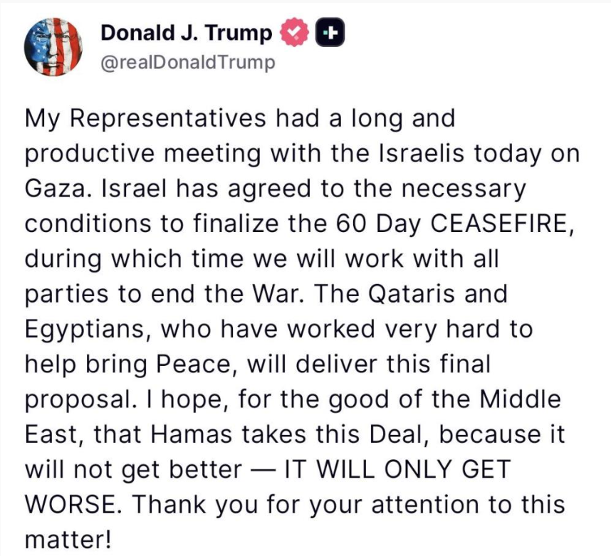 Bu süre zarfında tüm taraflarla birlikte savaşın sona erdirilmesi için çalışacaklarını kaydeden Trump, "Barışın sağlanması için çok çaba harcayan Katar ve Mısır, bu nihai teklifi sunacak. Hamas, Orta Doğu’nun iyiliği için umarım bu anlaşmayı kabul eder. Çünkü aksi daha iyi olmayacak. Sadece daha kötü olacak" dedi.