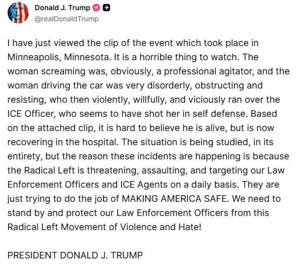 ABD Başkanı Donald Trump, ABD Göçmenlik ve Gümrük Muhafaza Dairesi (ICE) ajanlarının verilen emre uymayan ve aracıyla hareket eden bir kadını vurarak öldürmesi ile ilgili olarak,