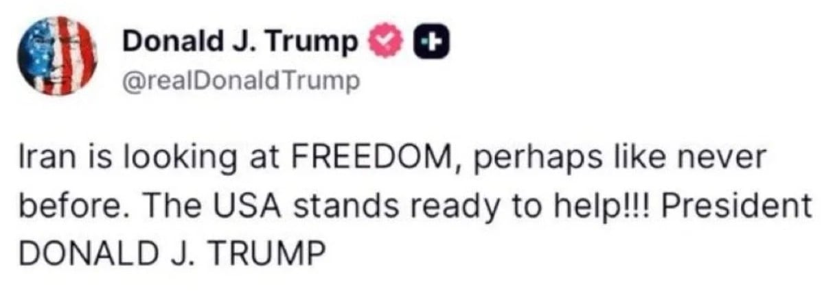 "İran özgürlüğü hiç olmadığı kadar arıyor. Biz bu konuda yardım etmeye hazırız" mesajını paylaştı. Trump'ın bu paylaşımı, İran yönetiminin internet kesintisi ve sert müdahalelerine karşı bir hamle olarak yorumlandı.