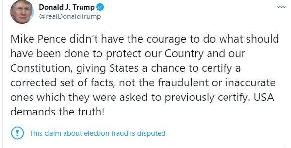 Trump, sosyal medya hesabından yaptığı paylaşımda, Pence'e yönelik şu ifadelere yer verdi, "Mike Pence, ülkemizi ve anayasamızı korumak için yapılması gerekeni yapacak cesarete sahip değildi. ABD gerçeği istiyor!"