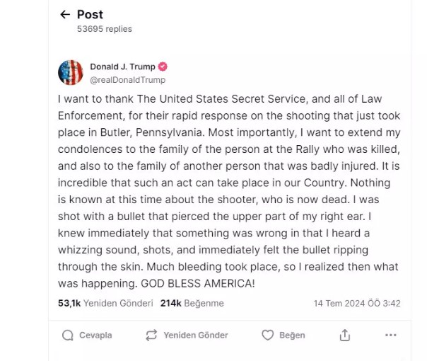 Trump, kendine ait Truth adlı sosyal mecran üzerinden yaptığı açıklamada, "Bir vızıltı sesi, silah sesleri duyduğumda bir şeylerin ters gittiğini hemen anladım ve kurşunun derimi parçaladığını hissettim. Çok fazla kanama oldu, o zaman ne olduğunu anladım" ifadelerini kullandı.