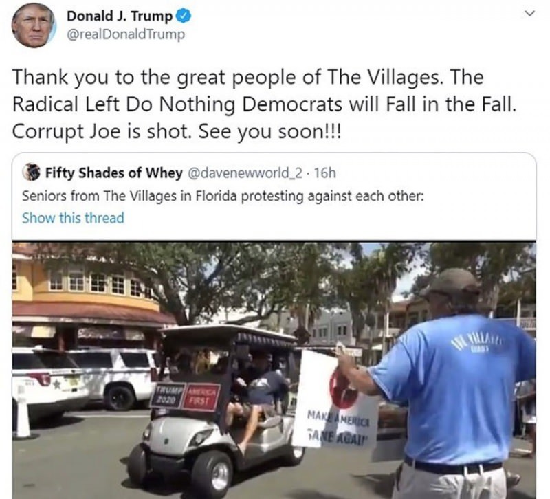 ABD Başkanı Donald Trump, sosyal medyayı aktif olarak kullanan liderlerin başında geliyor. Başkan Trump, bugün sosyal medya hesabında “The Villages’taki harika insanlara teşekkür ediyorum. Radikal Sol Hiçbir Şey Yapmıyor Demokratlar Sonbaharda Düşecek. Yolsuz Joe postu deldirdi. Yakında görüşmek üzere!!!” başlığı ile bir video paylaştı.
