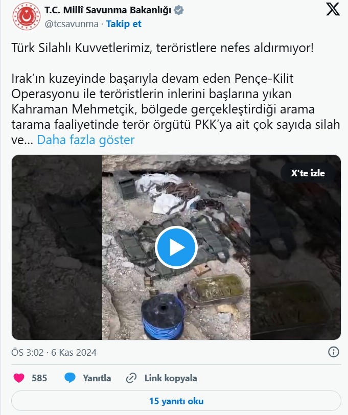 Bakanlıktan yapılan açıklamada, Pençe-Kilit Operasyonu ile teröristlerin inlerini başlarına yıkan Mehmetçiğin bölgede gerçekleştirdiği arama tarama faaliyetinde terör örgütüne ait çok sayıda silah ve mühimmatın ele geçirilerek kullanılamaz hale getirildiği belirtildi.