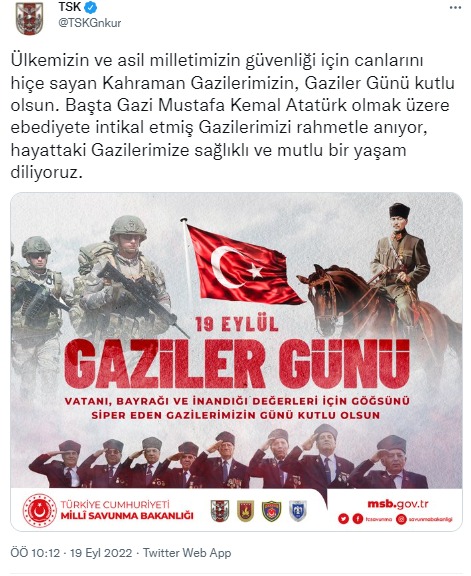 TSK’nın Gaziler Günü’ne ilişkin sosyal medya paylaşımında, “Ülkemizin ve asil milletimizin güvenliği için canlarını hiçe sayan Kahraman Gazilerimizin, Gaziler Günü kutlu olsun. Başta Gazi Mustafa Kemal Atatürk olmak üzere ebediyete intikal etmiş Gazilerimizi rahmetle anıyor, hayattaki Gazilerimize sağlıklı ve mutlu bir yaşam diliyoruz” ifadeleri kullanıldı.