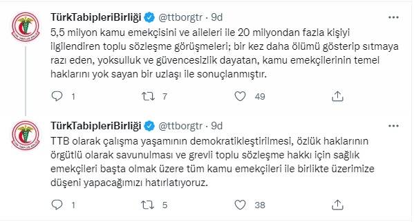 Sosyal medya hesabı üzerinden yaptığı paylaşım ile zam oranını eleştiren TTB, “5,5 milyon kamu emekçisini ve aileleri ile 20 milyondan fazla kişiyi ilgilendiren toplu sözleşme görüşmeleri; bir kez daha ölümü gösterip sıtmaya razı eden, yoksulluk ve güvencesizlik dayatan, kamu emekçilerinin temel haklarını yok sayan bir uzlaşı ile sonuçlanmıştır. TTB olarak çalışma yaşamının demokratikleştirilmesi, özlük haklarının örgütlü olarak savunulması ve grevli toplu sözleşme hakkı için sağlık emekçileri başta olmak üzere tüm kamu emekçileri ile birlikte üzerimize düşeni yapacağımızı hatırlatıyoruz” ifadelerini kullandı.