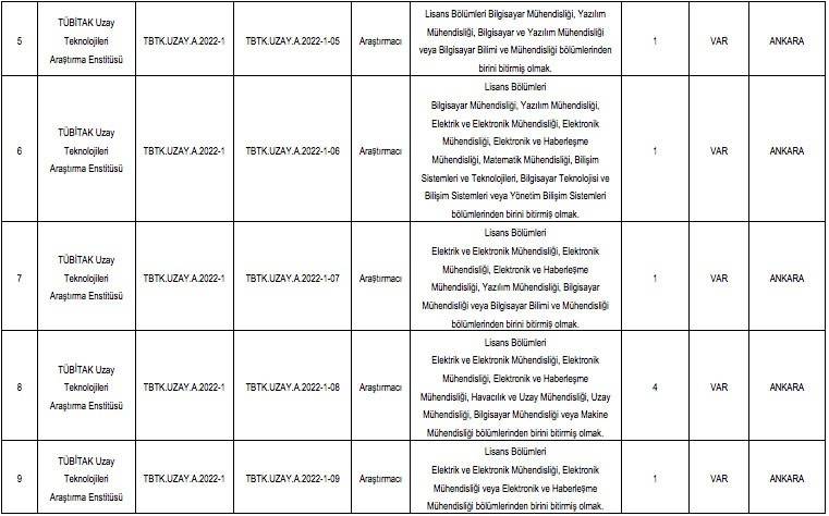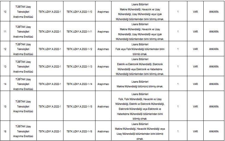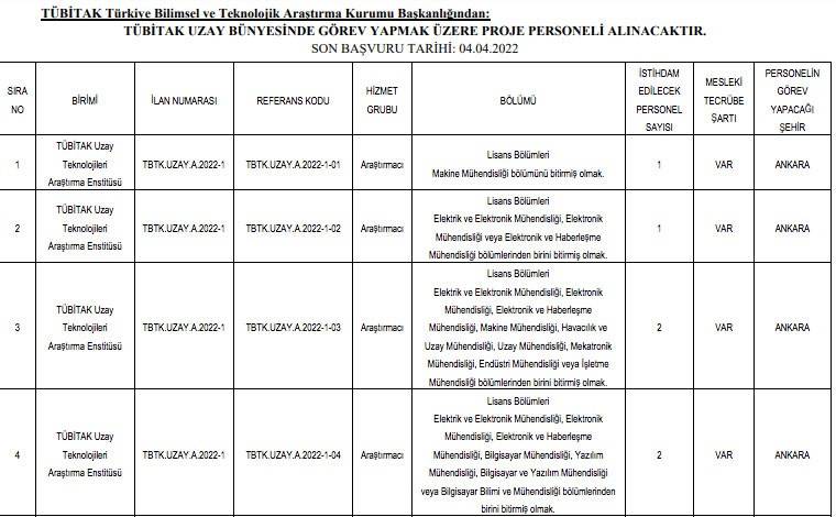 Resmi Gazete'de yer alan bilgilere göre, TÜBİTAK, 74 personel alacak. TÜBİTAK Türkiye Bilimsel ve Teknolojik Araştırma Kurumu Başkanlığı’ndan yapılan açıklamada, ”TÜBİTAK Uzay bünyesinde görev yapmak üzere proje personeli alınacaktır.” denildi. Son başvuru tarihi 04.04.2022 olarak açıklandı.
