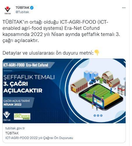 TÜBİTAK’ın ortak olarak yer aldığı ICT-AGRI-FOOD (ICT-enabled agri-food systems) Era-Net Cofund projesi kapsamında 2020 ve 2021 yıllarında 2 adet çağrıya katılım sağlanmış olup, 2022 yılı Nisan ayında 3. çağrının açılması planlanmaktadır. İlgili çağrı kapsamında, Avrupa tarım-gıda sistemlerinin sürdürülebilir, esnek, adil ve şeffaf sistemlere dönüşümü amacıyla dijital çözümlerin geliştirilmesini hedef alan çok uluslu, çok disiplinli araştırma ve yenilik projeleri desteklenecek.