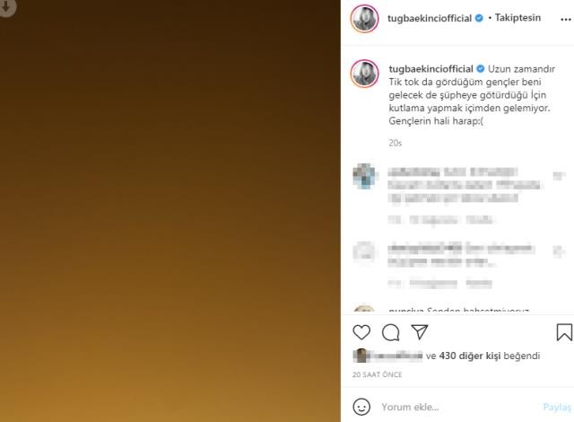 Ekinci, "23 Nisan'ı neden kutlamadınız?" sorusuna sosyal medya üzerinden cevap vererek "Uzun zamandır TikTok'ta gördüğüm gençler, beni gelecekte şüpheye götürdüğü için kutlama yapmak içimden gelmiyor. Gençlerin hali harap!" dedi.