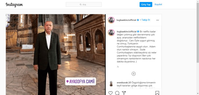 Erdoğan’ın Ayasofya’da çekilmiş bir fotoğrafını paylaşan Ekinci, “Bir Netflix kadar değeri yokmuş̧ gibi davranmanız çok ayıp, ananızdan Netflix’le mi doğdunuz? Canı öyle uygun görmüş̧ ne olmuş̧. Türkiye’nin Cumhurbaşkanına saygılı olun” dedi.