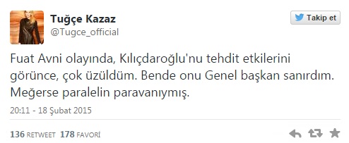 Kazaz, Twitter hesabından, "Fuat Avni olayında, Kılıçdaroğlu'nu tehdit etkilerini görünce çok üzüldüm" yazan Tuğçe Kazaz "Bende onu Genel başkan sanırdım. Meğerse paralelin paravanıymış" ifadelerini kullandı.