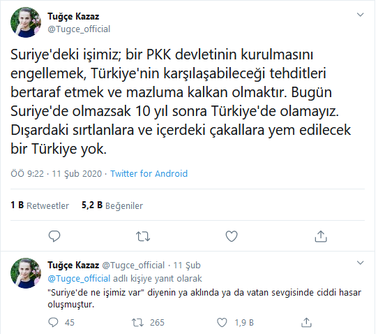 Tuğçe Kazaz sosyal medya hesabından yaptığı paylaşımda, "Suriye'deki işimiz; bir PKK devletinin kurulmasını engellemek, Türkiye'nin karşılaşabileceği tehditleri bertaraf etmek ve mazluma kalkan olmaktır. Bugün Suriye'de olmazsak 10 yıl sonra Türkiye'de olamayız. Dışardaki sırtlanlara ve içerdeki çakallara yem edilecek bir Türkiye yok. 'Suriye'de ne işimiz var' diyenin ya aklında ya da vatan sevgisinde ciddi hasar oluşmuştur." dedi.