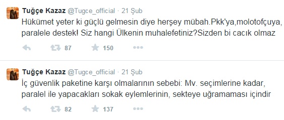 Son günlerde gündeme yönelik yaptığı açıklamalarla adından sıkça söz ettiren Tuğçe Kazaz, mecliste yerlere oturarak, kürsüde slogan atarak tıkamaya görüşmeleri tıkamaya çalışan muhalefet partilerine yaylım ateşi açtı. Kazaz Twitter hesabından yaptığı açıklamada, muhalefetin iç güvenlik paketine karşı olmasının, milletvekili seçimlerine kadar paralel yapı ile yapacakları sokak eylemlerinin sekteye uğramaması için olduğunu söyledi.