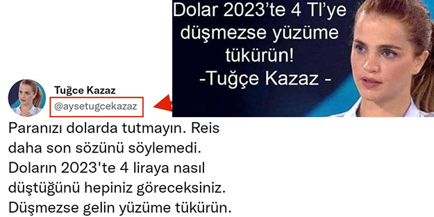 Konuyla ilgili konuşan Tuğçe Kazaz, "Dolar 4 TL'ye düşecek sözü bana ait olmadığı halde bunu bana aitmiş gibi yazanlar ve ısrarla yayanlar hakkında tüm yasal haklarımı sonuna kadar kullanacağımdan kimsenin şüphesi olmasın. Biraz şerefli olun, yalan ve iftiradan vazgeçin, insan gibi beyninizi kullanın. Yok mu?!" dedi.
