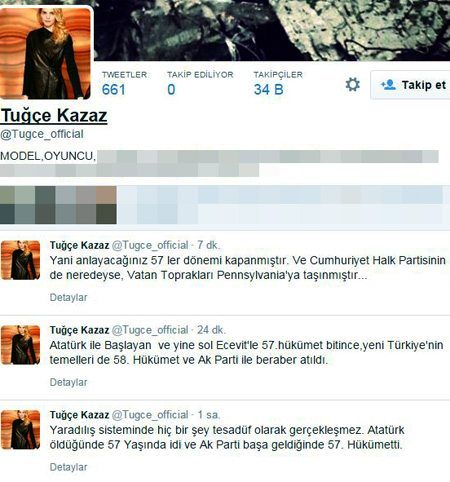 Eski manken Tuğçe Kazaz, M.Kemal'in 57 yaşında yaşama veda etmesiyle AK Parti 'nin ilk kurduğu hükümetin 57'nci hükümet olmasını bir neticeye bağlıyarak “Yaradılış sisteminde hiç bir şey tesadüf olarak gerçekleşmez” ifadesini kullandı.