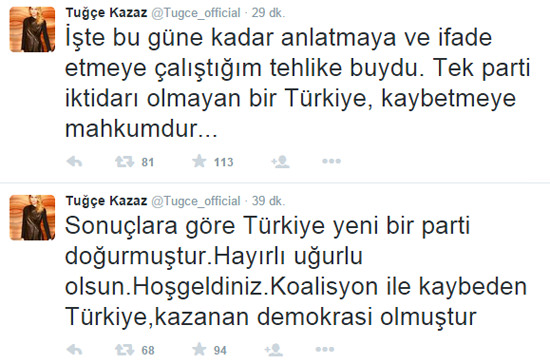 Tuğçe Kazaz'dan seçim sonuçlarına ilişkin tweetleri olay oldu.