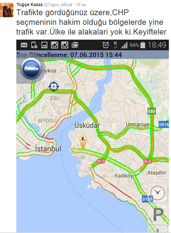 CHP'li seçmenin yoğun olarak yaşadığı, Kadıköy, Şişli, Ataşehir ve Beşiktaş gibi semtlerin trafik yoğunluğuna ilişkin bir görsel paylaşan Tuğçe Kazaz, fotoğrafın altına "Trafikte gördüğünüz üzere CHP seçmeninin hakim olduğu bölgelerde yine trafik var. Ülke ile alakaları yok ki, keyifteler" notunu düştü.