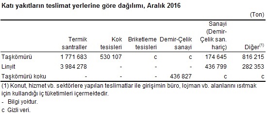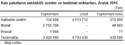 Buna göre, katı yakıtların 2016 yılı Aralık ayı toplam satılabilir üretim miktarlarına bakıldığında; taşkömürünün 134 bin 608 ton, linyitin 4 milyon 513 bin 712 ton ve taşkömürü kokunun 370 bin 969 ton, teslimat miktarlarına bakıldığında ise; taşkömürünün 3 milyon 420 bin 690 ton, linyitin 4 milyon 703 bin 430 ton ve taşkömürü kokunun 439 bin 596 ton olarak gerçekleştiği görüldü.