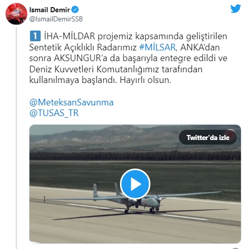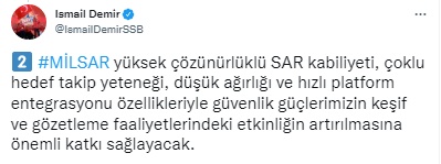 Demir paylaşımında, "İHA-MİLDAR projemiz çerçevesinde geliştirilen Sentetik Açıklıklı Radarımız MİLSAR, ANKA'dan sonra AKSUNGUR'a da başarıyla entegre edildi ve Deniz Kuvvetleri Komutanlığımız tarafından kullanılmaya başlandı. Hayırlı olsun. MİLSAR yüksek çözünürlüklü SAR kabiliyeti, çoklu hedef takip yeteneği, düşük ağırlığı ve hızlı platform entegrasyonu özellikleriyle güvenlik güçlerimizin keşif ve gözetleme faaliyetlerindeki etkinliğin artırılmasına önemli katkı sağlayacak" ifadelerine yer verdi.