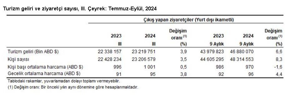 Türkiye İstatistik Kurumu (TÜİK), 3'üncü çeyrek turizm istatistiklerini açıkladı. Buna göre; turizm geliri 3'üncü çeyrekte bir önceki yılın aynı çeyreğine göre yüzde 3,9 artarak 23 milyar 219 milyon 751 bin dolar oldu. Turizm gelirinin yüzde 14,7'si Türkiye'yi ziyaret eden yurt dışı ikametli gurbetçi vatandaşlardan elde edildi. 3'üncü çeyrekte yapılan harcamaların 15 milyar 77 milyon 957 bin dolarını kişisel harcamalar, 8 milyar 141 milyon 794 bin dolarını ise paket tur harcamaları oluşturdu. Türkiye'den çıkış yapan ziyaretçi sayısı 2024 yılı 3'üncü çeyreğinde bir önceki yılın aynı çeyreğine göre yüzde 3,5 artarak 23 milyon 206 bin 579 kişi oldu. Ziyaretçilerin yüzde 12,2'sini 2 milyon 835 bin 74 kişi ile gurbetçi vatandaşlar oluşturdu. 3'üncü çeyrekte Türkiye'den çıkış yapan ziyaretçilerin gecelik ortalama harcaması 95 dolar oldu. Yurt dışında ikamet eden vatandaşların gecelik ortalama harcaması ise 62 dolar oldu.