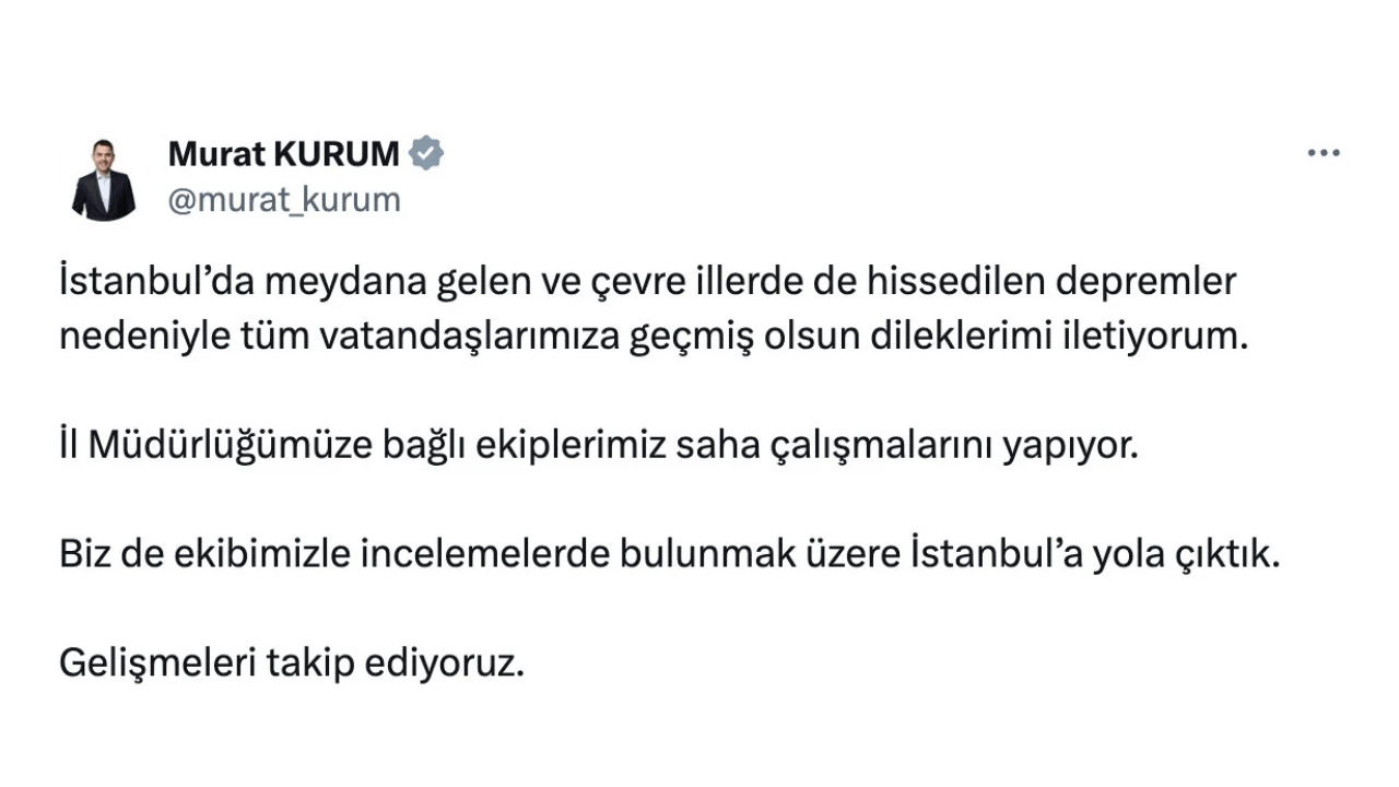 İnceleme yapmak üzere İstanbul'a doğru yola çıktığını söyleyen Bakan Kurum, "İstanbul’da meydana gelen ve çevre illerde de hissedilen depremler nedeniyle tüm vatandaşlarımıza geçmiş olsun dileklerimi iletiyorum.