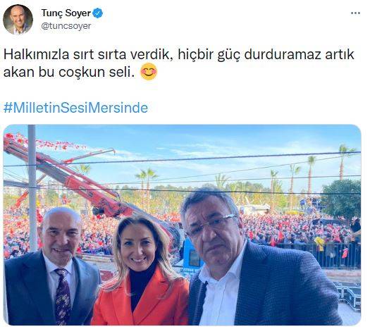 Pazarcıların, belediyenin yardımı olmadan kendi başlarının çaresine baktığı anlarda Tunç Soyer Mersin'de zevkü sefasını sürdürdü. İzmir'de vatandaşın geçim kaynağı sular altında kalırken, Tunç Soyer, sosyal medya hesabından Mersin mitingine ilişkin paylaştığı fotoğrafta, "Halkımızla sırt sırta verdik, hiçbir güç durduramaz artık akan bu coşkun seli." ifadelerini kullandı.