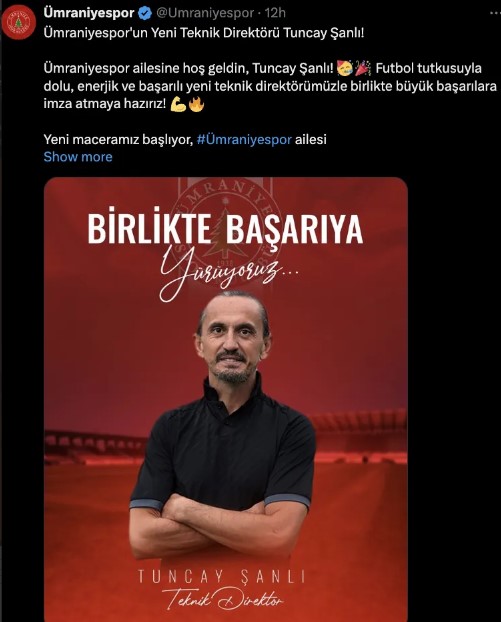 Ümraniyespor, teknik direktörlük görevine Tuncay Şanlı'nın getirildiğini duyurdu. Yapılan açıklamada, "Ümraniyespor'un Yeni Teknik Direktörü Tuncay Şanlı! Ümraniyespor ailesine hoş geldin, Tuncay Şanlı! Futbol tutkusuyla dolu, enerjik ve başarılı yeni teknik direktörümüzle birlikte büyük başarılara imza atmaya hazırız!" ifadeleri kullanıldı.