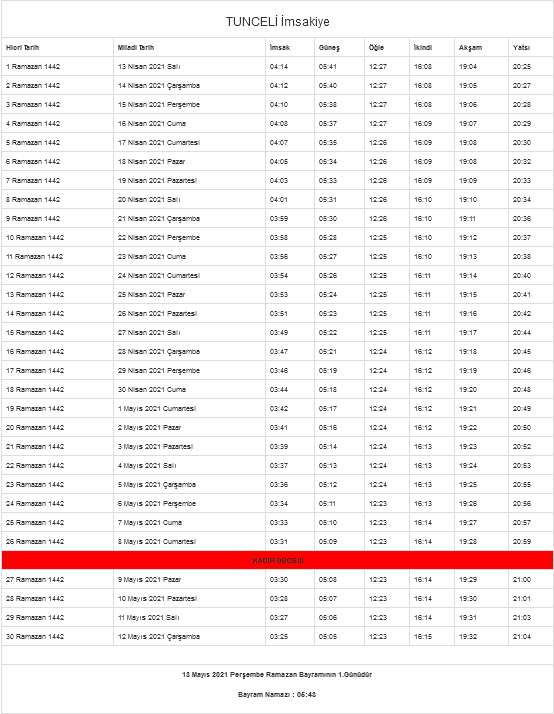 Tunceli’da Ramazan Bayram namazı saati 05:43 olarak Diyanet namaz vakitleri sayfasında açıkladı. İşte Tunceli imsakiyesi 2021: