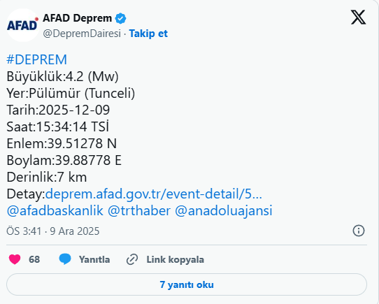 AFAD, depremin 9 Aralık 2025, saat 15:34’te meydana geldiğini bildirdi.