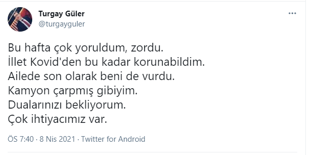 Turgay Güler "Bu hafta çok yoruldum, zordu. İllet Kovid'den bu kadar korunabildim. Ailede son olarak beni de vurdu. Kamyon çarpmış gibiyim. Dualarınızı bekliyorum" dedi.