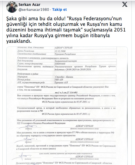 Acar, kendisine imzalatılan belgeyi paylaşarak "Şaka gibi ama bu da oldu! 'Rusya Federasyonu'nun güvenliği için tehdit oluşturmak ve Rusya'nın kamu düzenini bozma ihtimali taşımak' suçlamasıyla 2051 yılına kadar Rusya'ya girmem bugün itibarıyla yasaklandı" ifadesiyle açıklama yaptı.