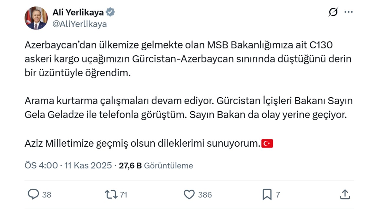 MSB, Türk askeri kargo uçağının düştüğünü açıklamıştı. İçişleri Bakanı Ali Yerlikaya konuya dair paylaşım yaptı. Paylaşımda arama-kurtarma faaliyetlerinin devam ettiğini vurguladı.