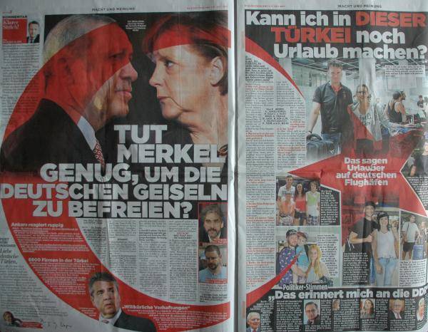 Almanya’nın yaklaşık 4,5 milyon tirajlı günlük bulvar gazetesi ‘Bild’ bugün piyasaya çıkan sayısında Almanya –Türkiye arsında yaşanan krizi manşete taşıdı. Gazete manşetinde "Erdoğan artık tatilcileri mi tutukluyor" başlığını kullandı. Bild gazetesi 2., 3. sayfalarında, tam sayfa iki ülke arasında yaşanan krize geniş yer verdi.